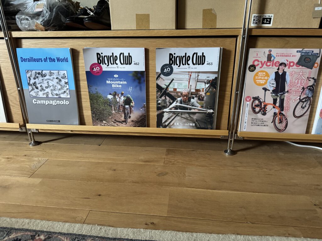 ご来店頂いたお客様の中はお気づきになった方もいらっしゃると思いますが、当店では自転車に関する本や雑誌等をディスプレイしております。これらは単なる飾りではなく、れっきとした書物。皆様がご自由にお手に取って読んで頂けるようになっております。